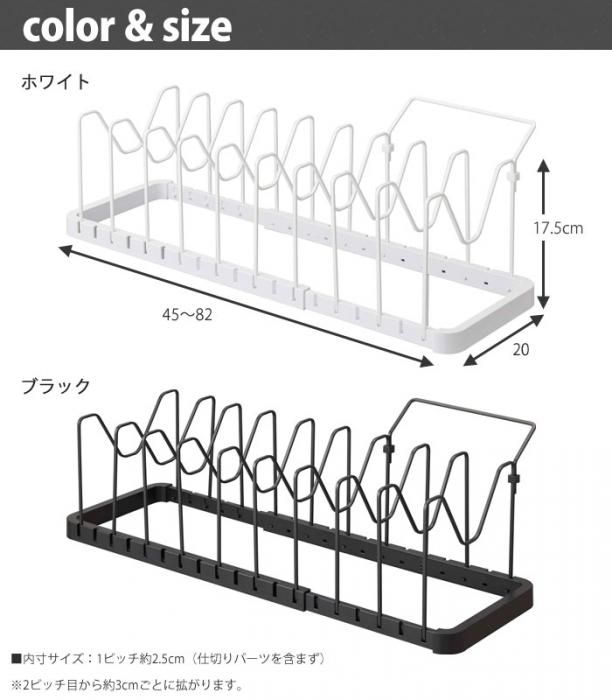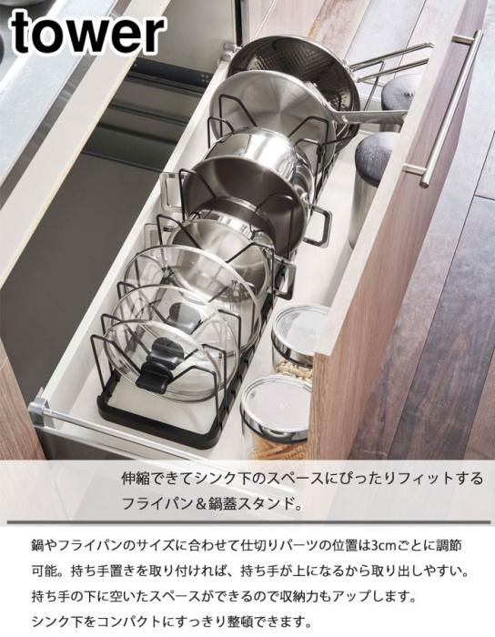 タワー シンク下伸縮鍋蓋&フライパンスタンド 3840/3841 送料無料 当日出荷 分類で探す キッチングッズ キッチン収納 すき間収納 ブランドで探す 山崎実業 タワー tower 価格帯(税込) 3,000円台の商品 キッチン用品 送料無料 ラッピング承ります 伸縮式でシンク下のスペースに合わせてぴったりフィットするフライパン&鍋蓋スタンドです 鍋やフライパンのサイズに合わせて仕切りパーツの位置は3cmごとに調整可能です tower-3840-1 3,960円(税込) 0円 tower-3840-1ホワイト3,960円(税込)ブラック3,960円(税込)在庫なしホワイト(取り寄せ)3,960円(税込)ブラック(取り寄せ)3,960円(税込) 数量 カートに入れる 製品について性能詳細お買い物ガイドクロッカについて 商品説明 伸縮できるからシンク下のスペースに合わせてピッタリフィットするフライパン&鍋蓋スタンド。鍋やフライパンのサイズに合わせて仕切りパーツの位置は3cmごとに調整できます。持ち手置き付きでフライパンなどの持ち手が上になるから取り出しやすく収納可能。下に空いたスペースができるから収納力もアップします。 材質本体:ABS樹脂仕切りパーツ:スチール(粉体塗装) 耐熱温度80〜-40度 サイズ約 W45〜82×D20×H17.5cm(持ち手置き含まず) 内寸サイズ1ピッチ約2.5cm(2ピッチ目から約3cmごとに拡がります。) 対応サイズ約18〜30cmまでの鍋(鍋蓋)・フライパン 商品重量約940g 生産国中国 備考 付属品:仕切りパーツ(×10)、持ち手置き(×1) 組立式 ブランド 製造元tower -タワー 山崎実業RERATED ITEMS関連商品タワー キッチンスタンド 6777/6778タワー ディッシュスタンド 7137/7138タワー なべ蓋&フライパンラック 7463/7464タワー レンジフード調味料ラックタワー レンジフードなべ蓋ホルダー 2979/2980タワー ディッシュラック ワイド L 2965/2966タワー ディッシュラック ワイド S 3147/3148タワー マグネット 冷蔵庫サイドラック 2744/2745