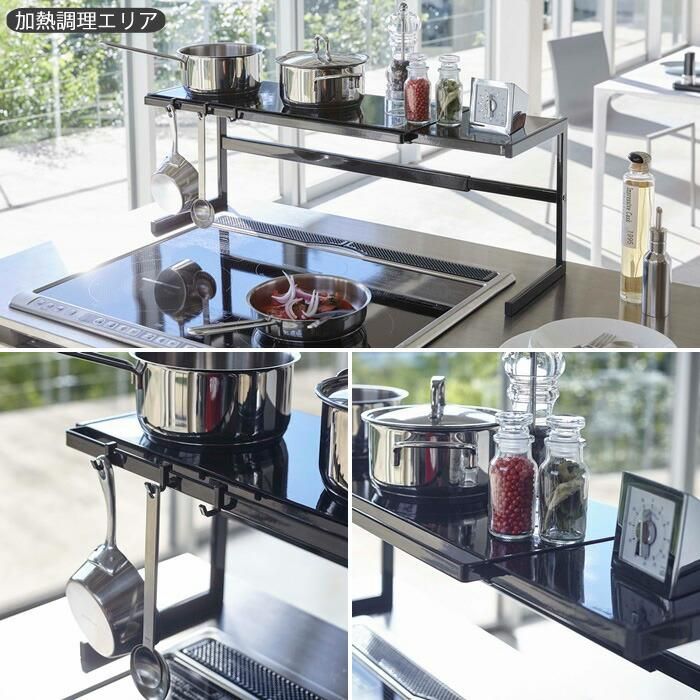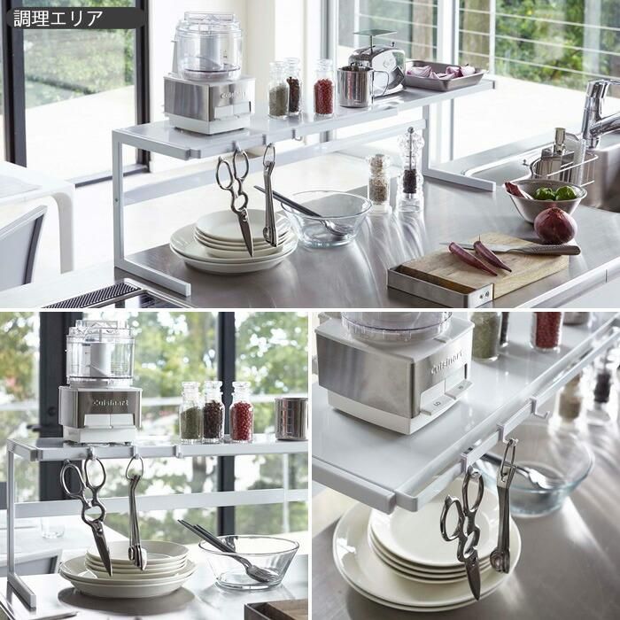 調理エリアに水回りエリア、加熱調理エリアとそれぞれの場所でキッチン作業のサポートをしてくれる便利なキッチンラックです。