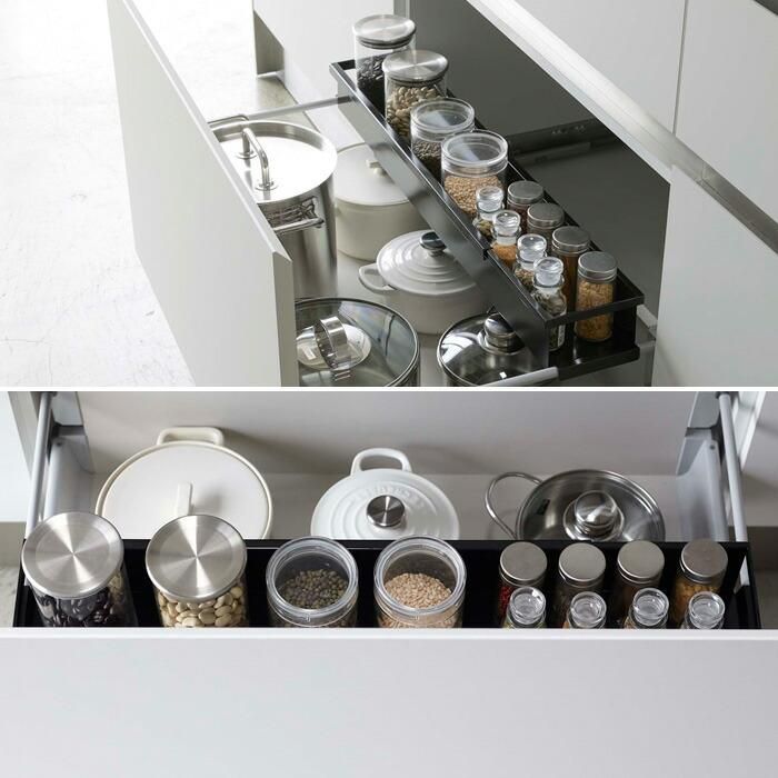 収納部の奥行きは約10cmとスリムなので、スパイスボトルや保存容器などの小物収納に便利です。