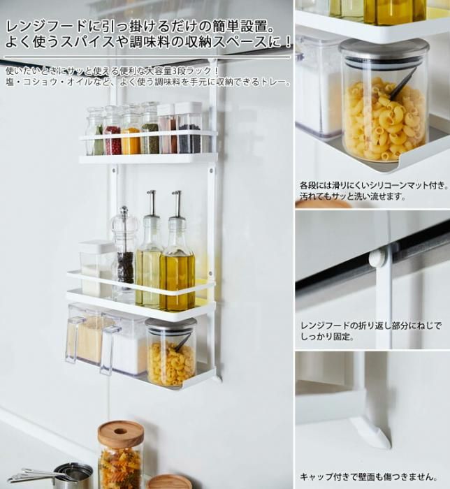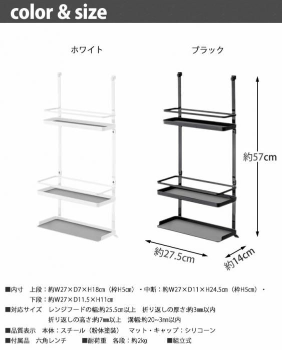 タワー レンジフード調味料ラック 3段 4836/4837 送料無料 当日出荷 分類で探す キッチングッズ キッチン収納 すき間収納 ブランドで探す 山崎実業 タワー tower 価格帯(税込) 4,000円台の商品 キッチン用品 送料無料 ラッピング承ります レンジフードに引っ掛けてスパイスや調味料の収納スペースに 塩・コショウ・オイルなど よく使う調味料やキッチン小物を手元に収納できる引っ掛けラック tower-4836-7 4,950円(税込)0円 在庫入荷待ちホワイト4,950円(税込)在庫なし4,950円(税込)ブラック4,950円(税込)4,950円(税込) 数量 カートに入れる 製品について性能詳細お買い物ガイドクロッカについて レンジフードに引っ掛けるだけ。スパイスや調味料の収納スペースに! 調味料やキッチン小物を使いたいときにサッと使える便利な大容量3段ラック!塩・コショウ・オイルなど、よく使う調味料を手元に収納できるトレー。各段には滑りにくいシリコーンマット付き。汚れてもサッと洗い流せます。レンジフードの折り返し部分にネジでしっかり固定できます。キャップ付きで壁面も傷付きません。 サイズ本体:(約)W27.5×D14×H57cm 内寸サイズ上段:(約)W27×D7×H18cm(枠H5cm)中段:(約)W27×D11×H24.5cm(枠H5cm)下段:(約)W27×D11.5×H11cm 材質本体:スチール(粉体塗装)、マット・キャップ:シリコーン 商品重量(約)1700g 耐荷重各段:(約)2kg 対応サイズレンジフードの幅:(約)25.5cm以上、折り返しの厚さ:(約)3mm以内、折り返しの高さ:(約)7mm以上、溝幅:(約)3〜20mm以内 備考中国生産組立式(六角レンチ付属) ブランド 製造元tower -タワー 山崎実業RERATED ITEMS関連商品タワー キッチンスタンド 6777/6778タワー ディッシュスタンド 7137/7138タワー なべ蓋&フライパンラック 7463/7464タワー レンジフード調味料ラックタワー レンジフードなべ蓋ホルダー 2979/2980タワー ディッシュラック ワイド L 2965/2966タワー ディッシュラック ワイド S 3147/3148タワー マグネット 冷蔵庫サイドラック 2744/2745