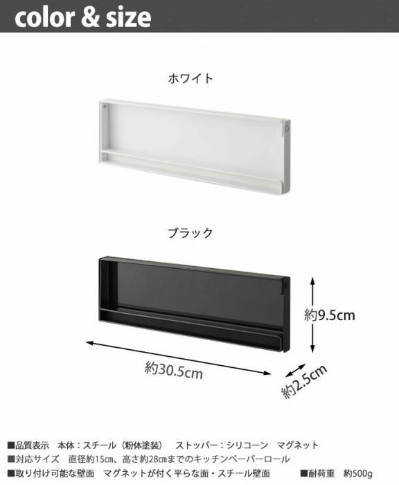 タワー 片手でカットマグネットキッチンペーパーホルダー 4941/4942 送料無料 当日出荷 分類で探す キッチングッズ キッチン収納 ペーパーホルダー ブランドで探す 山崎実業 タワー tower 価格帯(税込) 2,000円台の商品 キッチン 送料無料 ラッピング承ります 冷蔵庫に強力マグネットで簡単取り付け 片手でカットできるマグネットキッチンペーパーホルダーtower-4941-2 2,640円(税込)0円 在庫入荷待ちホワイト2,640円(税込)2,640円(税込)ブラック2,640円(税込)在庫なし2,640円(税込) 数量 カートに入れる 製品について性能詳細お買い物ガイドクロッカについて冷蔵庫に強力マグネットで簡単取り付け!片手でカットできるマグネットキッチンペーパーホルダー 冷蔵庫などマグネットがつく平らな面に取り付けできるキッチンペーパーホルダー。シリコーンのストッパーがキッチンペーパーをしっかりキャッチするから片手でもカットしやすく、使わないときにはフラットになるので邪魔にならないデザインです。キッチンペーパーロールを差し込むだけでセットできます。大判タイプの海外製キッチンペーパーロールに対応しています。 サイズ(約)W30.5×D2.5×H9.5cm(折り畳み時) 材質本体:スチール(粉体塗装)、マット・キャップ:シリコーン 商品重量(約)770g 耐荷重(約)500g 対応サイズ直径(約)15cm、高さ(約)28cmまでのキッチンペーパーロールマグネットが付く平らな面・スチール壁面に取り付け可能 備考中国生産 ブランド 製造元tower -タワー 山崎実業RERATED ITEMS関連商品タワー キッチンスタンド 6777/6778タワー ディッシュスタンド 7137/7138タワー なべ蓋&フライパンラック 7463/7464タワー レンジフード調味料ラックタワー レンジフードなべ蓋ホルダー 2979/2980タワー ディッシュラック ワイド L 2965/2966タワー ディッシュラック ワイド S 3147/3148タワー マグネット 冷蔵庫サイドラック 2744/2745
