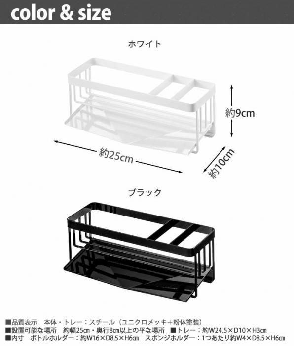 タワー 水が流れるスポンジ&ボトルホルダー 5016/5017 送料無料 当日出荷 分類で探す キッチングッズ キッチン小物 シンクまわり 水切りカゴ・トレー ブランドで探す 山崎実業 タワー tower 価格帯(税込) 2,000円台の商品 キッチン 送料無料 ラッピング承ります 水が流れる構造のトレーでスポンジやボトルから出る水を直接シンクの中に流せます スポンジホルダーとボトルホルダーを左右お好きな位置に設置できますtower-5016-7 2,420円(税込)0円 在庫入荷待ちホワイト2,420円(税込)在庫なし2,420円(税込)ブラック2,420円(税込)在庫なし2,420円(税込) 数量 カートに入れる 製品について性能詳細お買い物ガイドクロッカについて水が流れる構造のトレーでスポンジやボトルから出る水を直接シンクの中に流せます。 トレーが前と後ろどちらからも取り付けできるのでスポンジホルダーとボトルホルダーを左右お好きな位置に設置できます。 材質本体・トレー:スチール(ユニクロメッキ+粉体塗装) サイズ本体:(約) W25×D9×H9cmトレー:(約) W24.5×D10×H3cm 内寸サイズボトルホルダー:(約)W16×D8.5×H6cmスポンジホルダー:1つあたり(約)W4×D8.5×H6cm 設置可能な場所幅25cm・奥行8cm以上の平らな場所 商品重量(約)535g 備考中国生産 ブランド 製造元tower -タワー 山崎実業RERATED ITEMS関連商品