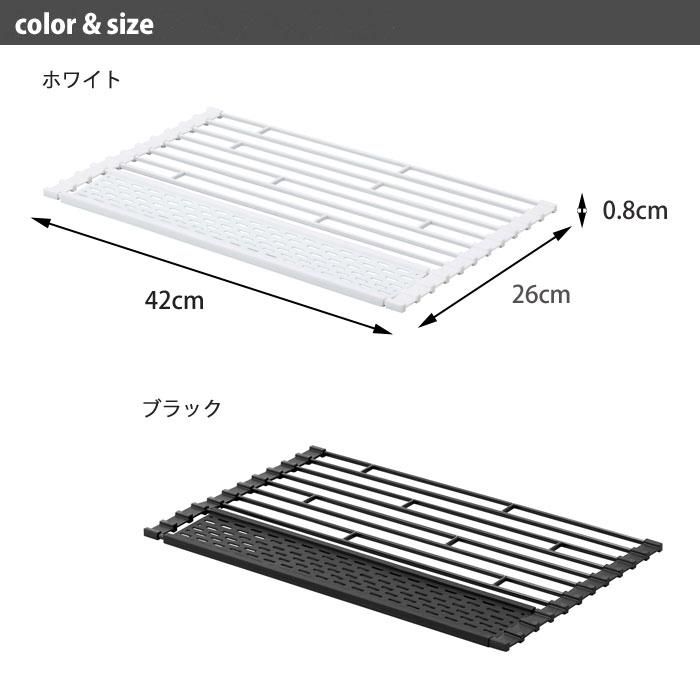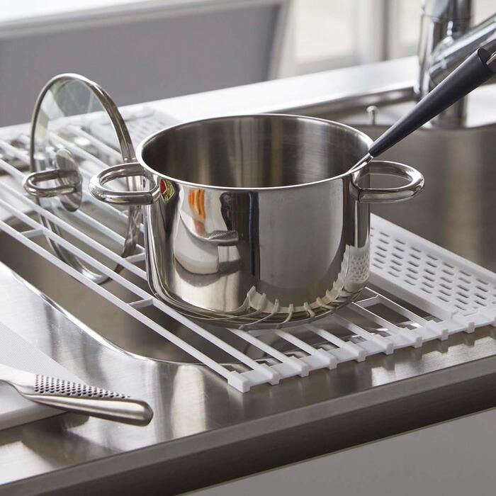シンク上に渡らせて簡単設置できる水切りラック。シリコーントレー付きなので、小さな物も水切りできます。使わない時はくるくる丸めてコンパクトに収納できます。