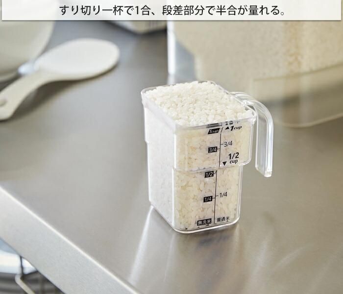 付属の段々米計量カップはすり切り一杯で1合、段差部分で半合が量れます。普通米と無洗米のメモリ付き。
