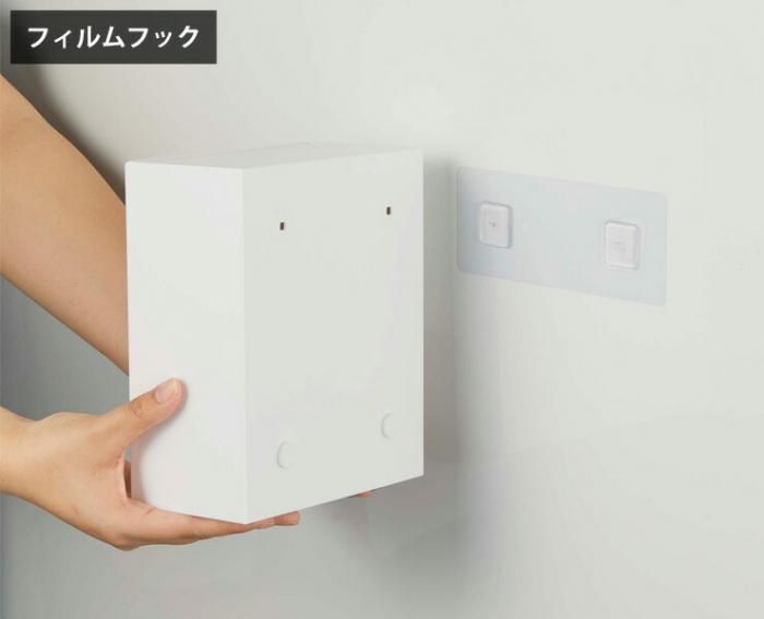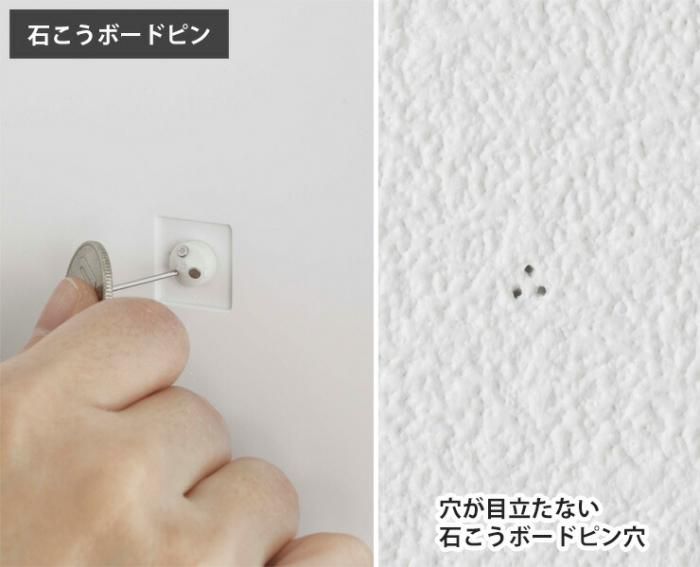 貼って剥がせるフィルムフックか、穴が目立たない石こうボードピンで壁面に取り付けられます。