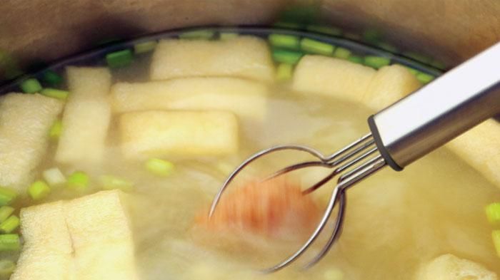 お玉の中に落とし、少しずつお湯を加えながらそのままかき混ぜると、先端部がホイッパーの様な働きをして菜箸やスプーンに比べて圧倒的に簡単に味噌を溶かすことができます。