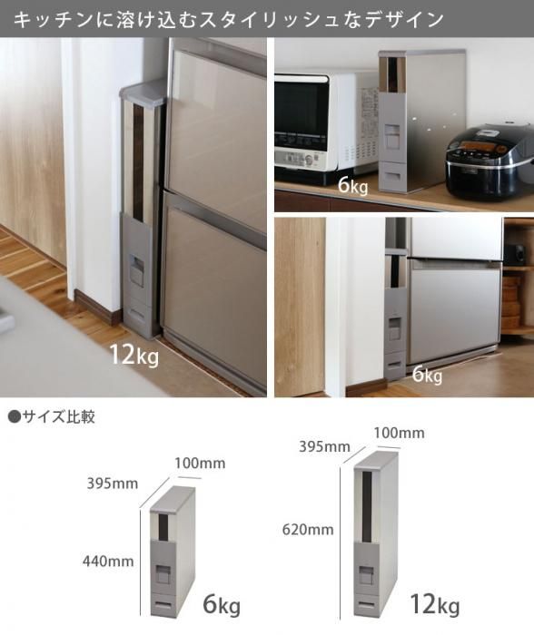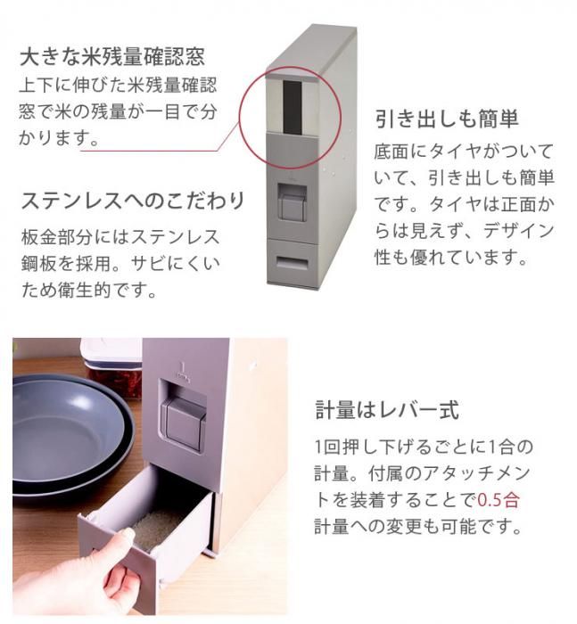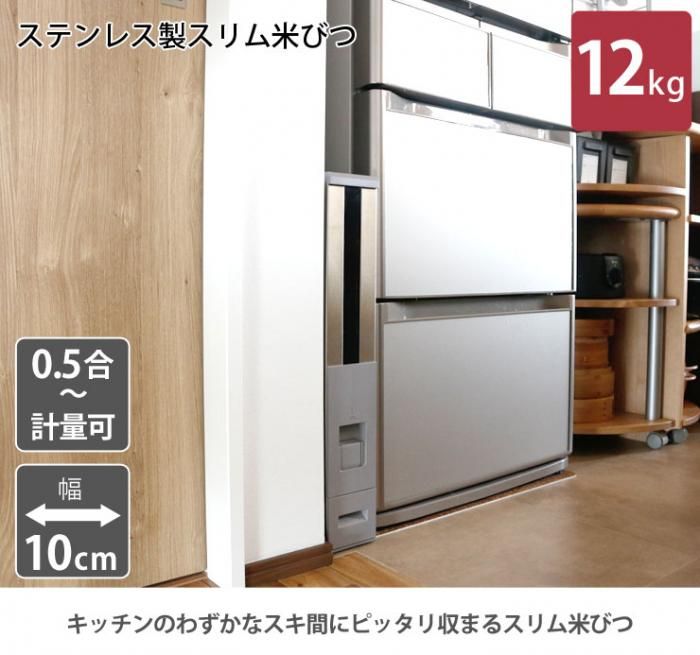 エムケー精工 ステンレス製スリム米びつ 12kg RCY-12SH 送料無料 当日出荷 分類で探す キッチングッズ キッチン小物 保存容器 米びつ ブランドで探す 価格帯(税込) 1万円台の商品 キッチン用品 送料無料 ラッピング承ります キッチンのわずかな隙間にぴったり収まるスリムな米びつ ワンタッチで1合ずつ計量出来て便利 付属の0.5合アタッチメントで0.5合ずつ計量することもできます mkseiko-rcy-12sh 12,980円(税込) 0円 在庫入荷待ち12kg12,980円(税込)在庫なし12,980円(税込)在庫なし SOLD OUT 製品について性能詳細お買い物ガイドクロッカについて キッチンのわずかな隙間にぴったり収まるスリムな米びつ 幅10cmでキッチンの隙間などに収納できるステンレス製米びつです。ワンタッチで1合ずつ計量出来て便利。付属の0.5合アタッチメントを取り付ければ、ごはん一膳分(0.5合)ずつ計量できます。また、底面にタイヤがついていて引き出すのも簡単。正面からはタイヤが見えずスマート。本体は清潔感のあるステンレス製で、キッチンに溶け込むスタイリッシュなデザインです。 ステンレスへのこだわり板金部分にはステンレス鋼板を採用し、堅牢な構造。また、錆びにくいため衛生的。 幅10cmとスリムな佇まいキッチンの様々な隙間にピッタリ収まるようなスリムさ。6kgモデルはシンク下に収納可能。 大きな米残量確認窓上下に伸びた大きな残量確認窓で米の残量が一目でわかる。 計量はレバー方式1回押し下げるごとに1合の計量ができるシンプルな計量方式。付属のアタッチメントを装着することで0.5合計量へ変更が可能。 サイズW100×D395×H620mm 容量米収納量:白米12kg米受け容量:白米4合 計量装置計量レバー方式:約150g(約1合 0.18L) 付属品0.5合アタッチメント、取扱説明書 重量約3.2kg 材質ステンレス鋼板,ポリスチレン,ポリプロピレン 生産国ベトナム 備考 冷蔵庫付近に設置する際は温度にご注意ください。高温になる箇所は、お米の劣化や虫発生の原因になります。 この米びつの計量方法は容量式のため、無洗米・分づき米・自家精米などを計量すると表示の重さと異なる場合があります。炊飯のときは、無洗米などの炊飯方法と炊飯器の取扱説明書を確認のうえ、水加減を調節してください。 米以外のものが計量部に入ると、故障の原因となります。 米びつ内は水洗いではなく、から拭きしてください。 RERATED ITEMS関連商品エムケー精工 ステンレス製スリム米びつ 6kg RCY-06SHスケーター 袋のまんま米びつ 防虫 5kg 計量カップ付き DRF5スケーター 袋のまんま米びつ 防虫 10kg 計量カップ付き DRF10スケーター 防虫米びつ 2kg用 計量カップ付き セリュー MAX3kgまでスケーター 防虫米びつ 5kg用 MAX7.5kgまでスケーター 防虫米びつ 10kg用 MAX11.5kgまでタワー 密閉 シンク下米びつ 5kg 3377/3378タワー 密閉 袋ごと米びつ 5kg 3375/3376プレート 密閉 シンク下米びつ 5kg 3379