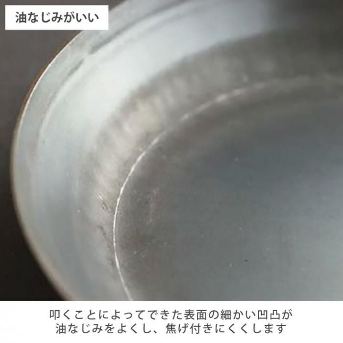 鉄はハンマーで打たれることで鋼となり、薄くても丈夫なフライパンとなります。また、表面に付いた細かな凹凸は油馴染みを良くします。
