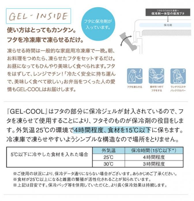 ジェルクールドーム S 300ml 保冷剤一体型ランチボックス 当日出荷 分類で探す キッチングッズ お弁当グッズ お弁当箱 ブランドで探す 三好製作所 ジェルクール GEL-COOL 価格帯(税込) 1,000円台の商品 キッチン用品 ラッピング承ります フタと保冷剤が一緒になった保冷ランチボックスS フタの内側をドーム型にすることで おかずを潰さずにふんわり盛り付けができます 汁漏れしにくい2点ロックのバッグルタイプ gelcool-domes 1,540円(税込) 在庫入荷待ちオールミルクホワイト1,540円(税込)1,540円(税込)オイスターグレー1,540円(税込)1,540円(税込)在庫なしベリーブルー1,540円(税込)在庫なし1,540円(税込)オールマカロンピンク1,540円(税込)1,540円(税込)マカロンブルー1,540円(税込)1,540円(税込)オマールブルー990円(税込)在庫なし1,540円(税込)在庫なし 数量 カートに入れる 製品について性能詳細お買い物ガイドクロッカについて サイズW11.5×D9.2×H6.8cm 容量約300ml 材質本体:ポリプロピレン (耐熱温度/耐冷温度:140℃/-20℃)保冷蓋:ABS樹脂 (耐熱温度/耐冷温度:60℃/-20℃)パッキン:シリコンゴム 使用方法保冷蓋を冷凍庫で6時間程凍らせてから本体にセットしてください。 保冷効果(外気温25℃) 15℃以下、4時間程度(外気温30℃) 15℃以下、3時間程度5度以下に冷やした食材を入れた場合ご使用の状況により、保冷データ通りにならない場合がございます。上記は目安です。保冷バッグ等を併用していただくと、より長く保冷効果は持続します。 生産国日本 備考 本体のみ電子レンジ、食洗機対応 (保冷蓋は非対応) RERATED ITEMS関連商品ジェルクールスクエア S 220ml 保冷剤一体型ランチボックス
