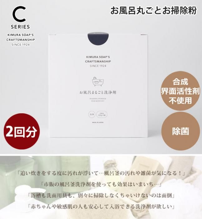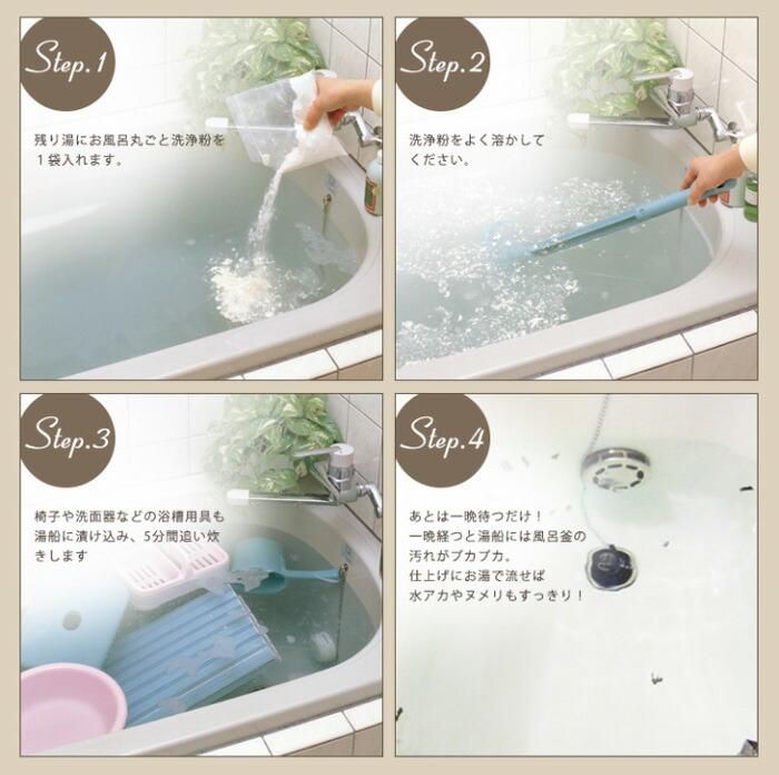 「お風呂まるごと洗浄剤」は、残り湯に入れてつけ置きするだけで、風呂釜から浴槽、洗面用具まで丸洗い。