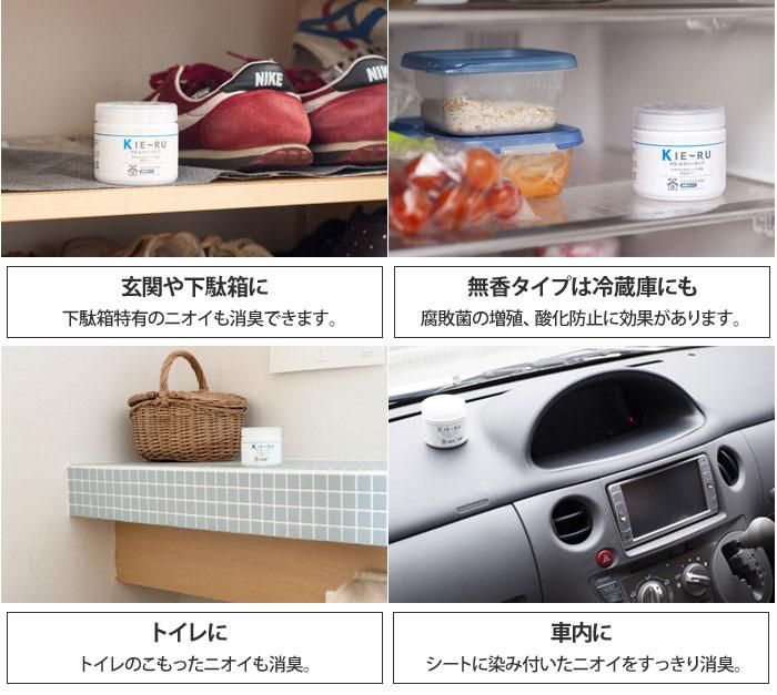 玄関や下駄箱、車内、トイレなどに置いてもしっかり消臭してくれます。無香タイプは冷蔵庫内に置くと腐敗菌の増殖を抑え、酸化防止にも効果があります。