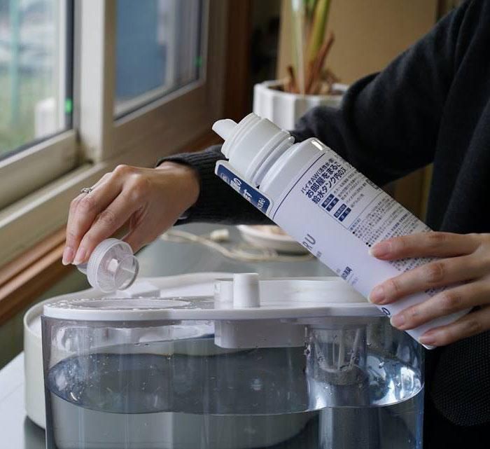 例:給水タンク1Lの場合、本液30ml(30倍希釈)〜10ml(100倍希釈)の投入量になります。お使いの加湿器・空気清浄機の給水タンクの大きさや、お部屋のニオイの状況にあわせて投入量を調節してください。