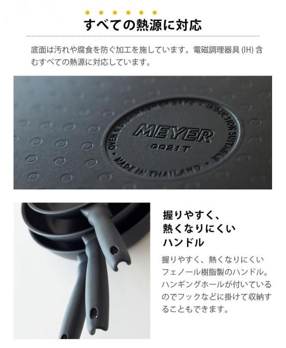 マイヤー ミッドナイト フライパン 20cm MNH-P20 送料無料 当日出荷 分類で探す キッチングッズ フライパン ブランドで探す マイヤー 価格帯(税込) 6,000円台の商品 キッチン用品 送料無料 ラッピング承ります オールブラックのフライパン 通常のアルミニウムより約8倍硬くなる硬質アルマイト加工で 軽さと丈夫さを両立 内面にはPFOAフリーのふっ素樹脂加工 IHを含むすべての熱源に対応 meyer-mnh-p20 6,050円(税込) 0円 在庫入荷待ちフライパン20cm6,050円(税込)6,050円(税込)在庫なし 数量 カートに入れる 製品について性能詳細お買い物ガイドクロッカについて - Midnight - すべてが黒、の美しさ オールブラックが美しく、どんなキッチンにも合うミニマルデザインが目を惹くミッドナイトシリーズ。使いやすい重量や耐久性など、見た目だけではない充実した機能美もこのシリーズの大きな特徴です。 通常のアルミニウムより約8倍硬い、硬質アルマイト加工。 リム周りやリベットにもふっ素樹脂加工を施すことで、食材がこびりつきにくく、お手入れ簡単。 汚れや腐食を防ぎ、電磁調理器 (IH) を含むすべての熱源に対応。 どんな料理でもこなす、調理面積が広く少し深めのデザイン。 縁にかけて柔らかく広がるフレアリムで、スープやソースも注ぎやすく。 握りやすく、熱くなりにくいフェノール樹脂製のハンドルにフックにかけられるハンギングホール。 20cmは目玉焼きやソテーなど、さっと炒めたいときに使いやすいサイズです。 サイズ約全長382 x 奥行215 x 高さ47mm 材質アルミニウム合金 (本体)、ステンレス鋼 (底面)、フェノール樹脂 (ハンドル) + ふっ素樹脂加工 (PFOA フリー) 重量約592g 対応熱源ガスコンロ、IH調理器(100V/200V)、ハロゲンヒーター、ラジエントヒーター、シーズヒーター 生産国タイまたは中国 サイズ20cm 26cm 28cmRERATED ITEMS関連商品