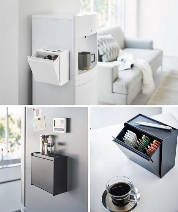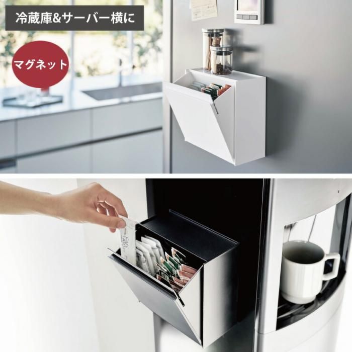 インスタントスティックやドリップパックの収納に。斜めに開閉するフラップ式だから片手でサッと取り出して飲めます。ウォーターサーバーや冷蔵庫の側面にマグネットで簡単取り付けできます。