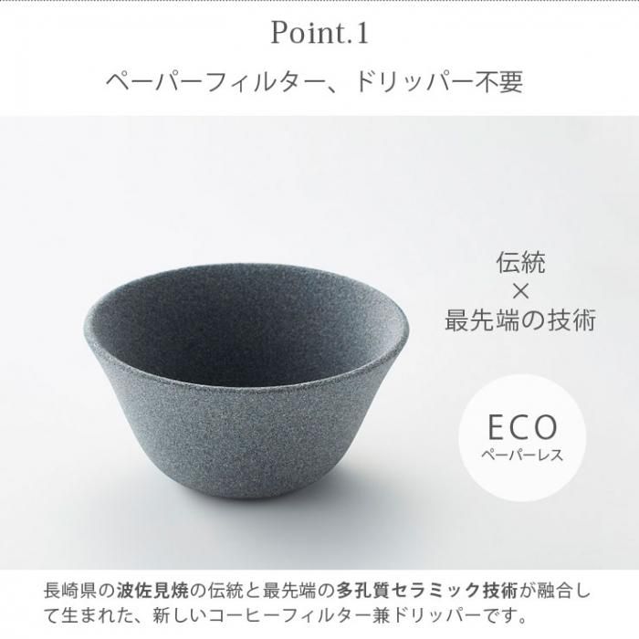 Cerafulは、400年以上の歴史を持つ長崎・波佐見焼の伝統と、最先端の多孔質セラミック技術が融合して生まれた、ペーパーフィルター不要のコーヒーフィルター兼ドリッパーです。