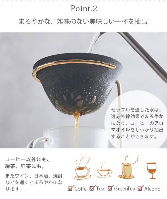 セラフルに通すことにより、水の残留塩素と不純物を除去し、まろやかに。ミクロの無数にあいた穴はコーヒーのうま味成分でもあるオイルまでも抽出し、マイルドで美味しい一杯を楽しめます。
