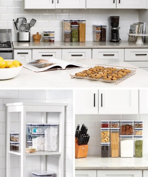 ボタンを押すだけでワンタッチ密閉 重ねて美しい収納ができるポップコンテナ スクエア形状の容器は省スペースで収納できるだけでなく 掴みやすく 角から中身を注ぎやすい