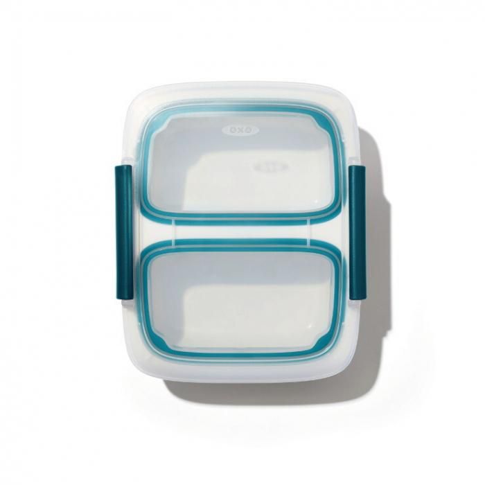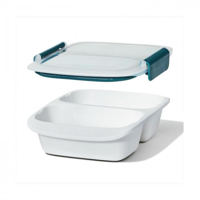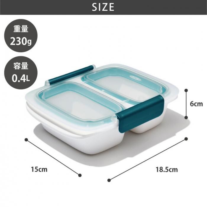 2つの独立して仕切られた容器で、食材を分けて持ち運べる小ぶりなサイズ。