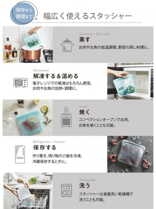 スタッシャー シリコーンバッグ EZハーフガロン 1.89L メール便 送料無料 当日出荷 分類で探す キッチングッズ キッチン小物 保存容器 キャニスター ブランドで探す スタッシャー 価格帯(税込) 2,000円台の商品 キッチン 送料無料 ラッピング承ります スタッシャー EZシリーズは口の部分が進化して簡単に開けることができます EZハーフガロンは 肉や魚の下ごしらえ(下味冷凍)や調理に適したサイズ 低温調理にもおすすめです stasher-sthgez 2,640円(税込) 0円 在庫入荷待ちクリア2,640円(税込)2,640円(税込)アクア2,640円(税込)2,640円(税込)在庫なしピンク2,640円(税込)2,640円(税込)ラベンダー2,640円(税込)在庫なし2,640円(税込)在庫なしブルー2,640円(税込)2,640円(税込) 数量 カートに入れる 製品について性能詳細お買い物ガイドクロッカについて スタッシャーは、繰り返し洗って使える サスティナブルなシリコーン製保存容器 スタッシャーは、繰り返し洗って使えるシリコーン製保存容器。EZシリーズは、口の部分が進化。力が弱い方でも指が小さい方でも簡単に開けることができます。 EZハーフガロンは、肉や魚の下ごしらえ(下味冷凍)や調理に適したサイズ。低温調理にもおすすめです。見た目も可愛くポーチ、小物入れとしても大活躍。旅行時の化粧品や洗面道具入れ、海やプールで濡らしたくないスマートフォンやキーなどのケースとしてもおすすめです。 幅広い温度に対応し、作り置きのおかずやご飯を冷凍、冷蔵保存し、そのまま電子レンジやオーブンで調理することができます。 洗えば何回でもリユースできます。 多くの医療用器具や乳幼児用の製品に使用されているピュアプラチナシリコーン100%で出来ています。 耐熱温度は250℃、耐冷温度は-18度。加熱・冷凍OK!幅広い温度に対応しています。 電子レンジ、オーブン、湯せんでの調理、冷蔵、冷凍での保存、食洗機での洗浄が可能です。 ピンチロックシステムで密閉できるので、液漏れもしません。 低温調理にもお使いいただけます。 サイズ縦26.7x横21.6xマチ4cm / 約1.89L / 約120g 材質シリコーンゴム 耐熱/耐冷温度耐熱温度 250℃ / 耐冷温度 -18℃ 生産国中国 使用上の注意 直火やオーブントースター、魚焼きグリルではご使用になれません。また、火のそばに置かないでください。 オーブンや電子レンジで加熱する際は必ず容器の口を開けた状態でお使いください。 液状のものを保存する場合は8分目を目安にし、しっかり口を閉じてください。また、重ねたり逆さにしないでください。 容器周りの凸凹は成型時の仕様であり品質には問題ありません。 食品によってシリコーンが変色することがございますが、使用上は問題ありません。 ブランドstasher -スタッシャーRERATED ITEMS関連商品