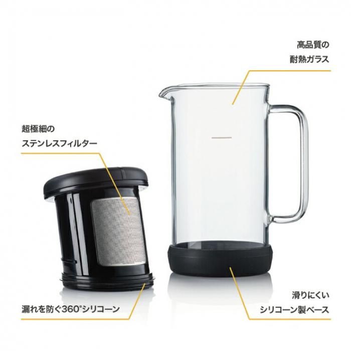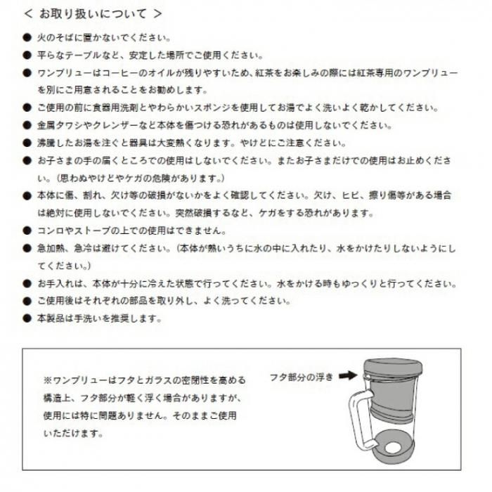バリスタアンドコー ワンブリュー 69004701 送料無料 当日出荷 分類で探す キッチングッズ 食器・カトラリー コーヒー・お茶用品 コーヒープレス ブランドで探す バリスタアンドコー BARISTA&CO 価格帯(税込) 4,000円台の商品 キッチン用品 送料無料 ラッピング承ります 独自のワンブリューフィルターシステムでブリューコーヒーを手軽に楽しめるコーヒーメーカー プレス不要でお湯を注ぐだけで美味しいコーヒーが淹れられます baristaco-onebrew 4,730円(税込) 0円 在庫入荷待ちOneBrew4,730円(税込)在庫なし4,730円(税込)在庫なし SOLD OUT 製品について性能詳細お買い物ガイドクロッカについて 独自のワンブリューフィルターシステムでブリューコーヒーを手軽に楽しめる BARISTA&CO One Brewを使えば、お好みのブリューコーヒーをずっと手軽に作ることが出来ます。独自のワンブリューフィルターシステムは、スムーズで質の高い抽出ができます。プレス不要のお湯を注ぐだけで美味しいコーヒーが淹れられます。 特殊なフィルターを使用しているので、使用後にフィルターにコーヒーが目詰まりせずに、お掃除も簡単にできます。忙しい朝の時間帯にピッタリのコーヒー器具です。ほぼグラスと同じようにキッチン棚に収納できるので余計な場所もとりません。また、コールドブリュー(水出しコーヒー)や紅茶を淹れるにも使用できます。容量は標準的なマグカップサイズです。 コーヒー豆の量:お湯350ccにつきコーヒー豆15gが目安です。(お好みで量を調整してください) 粉の粗さ:粗挽きがオススメです。 お湯の温度:湯温は、95℃〜100℃。新鮮な水を沸騰させ、火を止めてから1分ほどおいて使います。 蒸らし時間:4分 1)ビーカーに15gの粗挽きコーヒーを入れてラインまでお湯を注ぎます。2)コーヒー粉を軽く攪拌し、フィルターの蓋をセットしてください。3)4分が目安です。お好みの抽出時間をお試しください。4)あらかじめ温めておいたカップにコーヒーを注ぎます。 *ワンブリューはコーヒーのオイルが残りやすいため、紅茶をお楽しみの際には紅茶専用のワンブリューを別にご用意されることをお勧めします。 プレスなしで新鮮な淹れたてを味わえます たっぷりマグカップサイズ(350ml) 底面には耐熱製滑り止め付 フィルター設計によりコーヒーかすを捨てるのも簡単 紅茶用、コーヒー用、どちらでもお使いいただけます シンプルな設計で簡単洗浄、食洗機の使用可能 低めの濃さのコーヒーメーカー。とても簡単で手軽ながらも本格的なコーヒーを味わうことができます。クラシックなフレンチプレスですが、そのフォルムはスマートで美しく、ご自宅でゆったりとした時間をお過ごしいただけます。香り豊かでビロードのような滑らかさと濃厚な味わい。しっかりとした強い風味をお楽しみいただけます。 サイズW9.5×D6.5×H15.5cm 容量350ml 重量200g 材質本体:耐熱ガラス、ベース:シリコーンフィルター:ステンレススチールフタ:ポリプロピレン おすすめの挽き方粗挽き 生産国中国 RERATED ITEMS関連商品バリスタ&コー ブリューイットスティック 2バリスタアンドコー コアコーヒープレス 3Cups 350mlバリスタアンドコー ダイヤルインミルクピッチャー 420mlバリスタアンドコー ダイヤルインミルクピッチャー 600mlバリスタアンドコー ディスクペーパーフィルター 300枚入り 69005300バリスタ&コー バリスタ プロ ミルクピッチャー 400mlバリスタ&コー バリスタ プロ ミルクピッチャー 620mlバリスタ&コー ブリューイットスティック 2