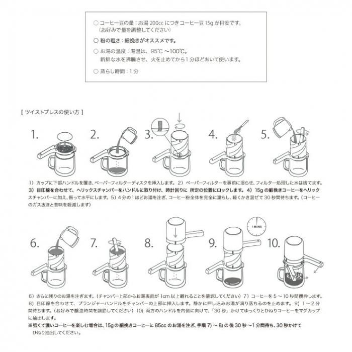 11) 強くて濃いコーヒーを楽しむ場合は、15gの細挽きコーヒーに85ccのお湯を注ぎ、手順7〜8の後30秒〜1分間待ち、30秒かけてひねり抽出してください。