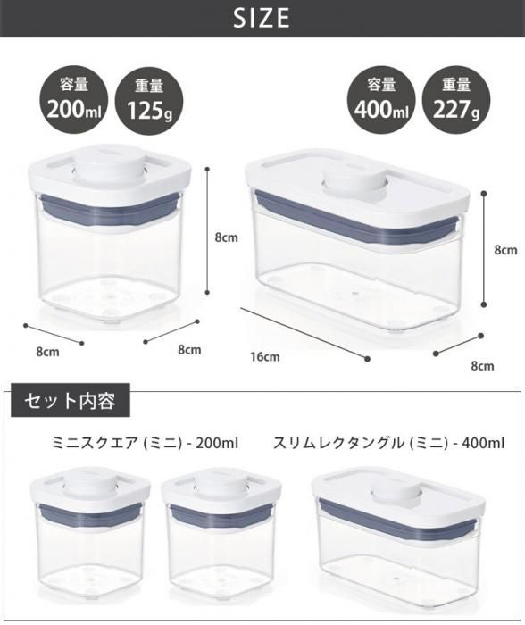 スクエア形状の容器は省スペースで収納できるだけでなく、掴みやすく、角から中身を注ぎやすいのも特徴です。毎日使うものだからこそ、使い勝手の良さを追求した保存容器です。