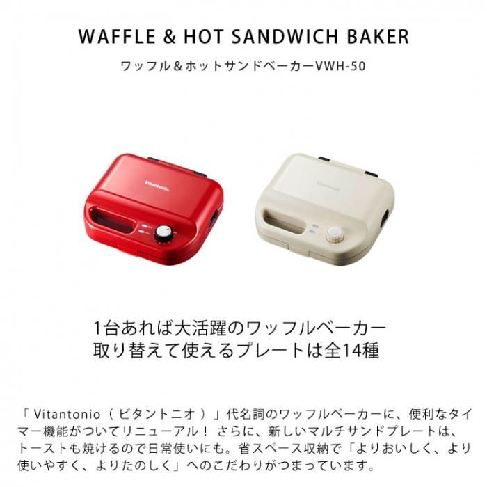 ワッフル、マルチサンドプレートの2種類のプレートが付属。プレートを取り替えてワッフルやホットサンドなど様々な調理ができます。