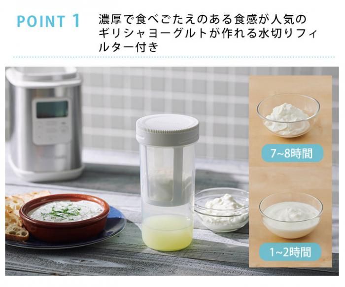 ●出来上がったヨーグルトを水切りできるフィルター付属。濃厚でたんぱく質豊富なギリシャヨーグルトを手作りで楽しめる。