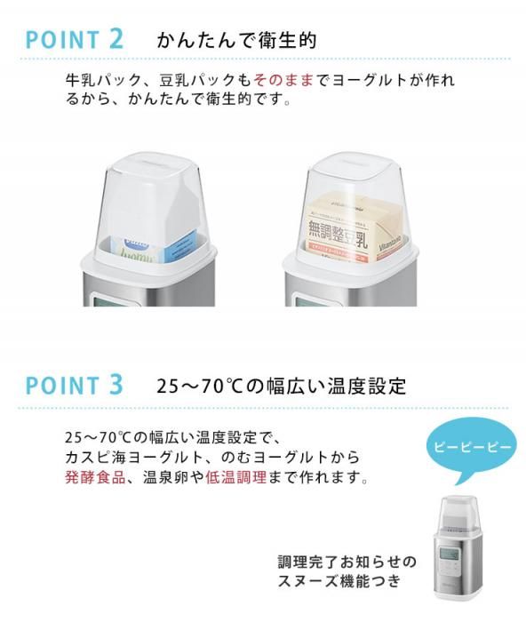 25℃〜70℃の温度設定機能で、体にやさしい発酵食品はもちろん、プレーンヨーグルトや、塩麹、甘酒、温泉卵やじっくりおいしい低温調理までこれひとつでかんたんに楽しめます。
