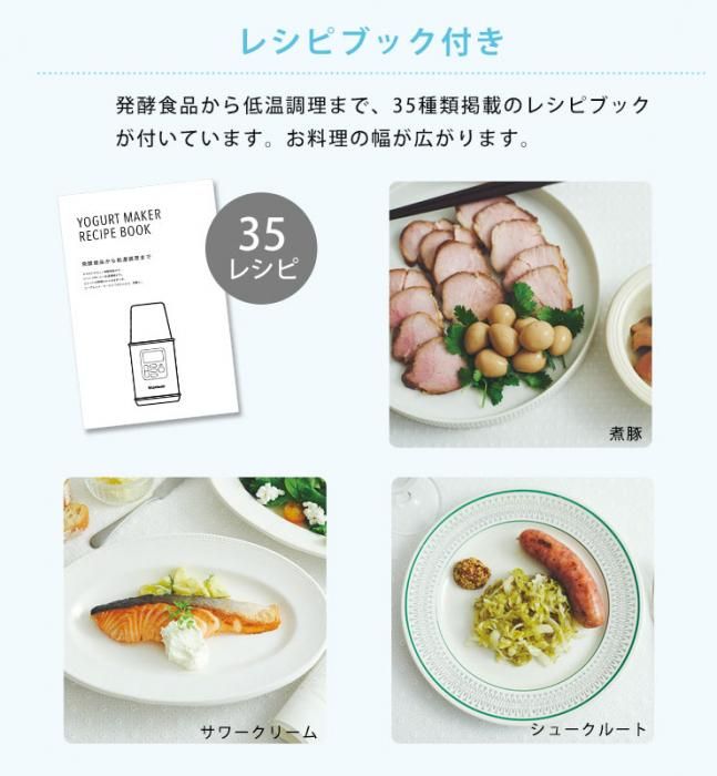 ●発酵食品から低温調理まで、35種類掲載のレシピブック付き。ギリシャヨーグルトやホエイを使ったアレンジレシピも掲載。