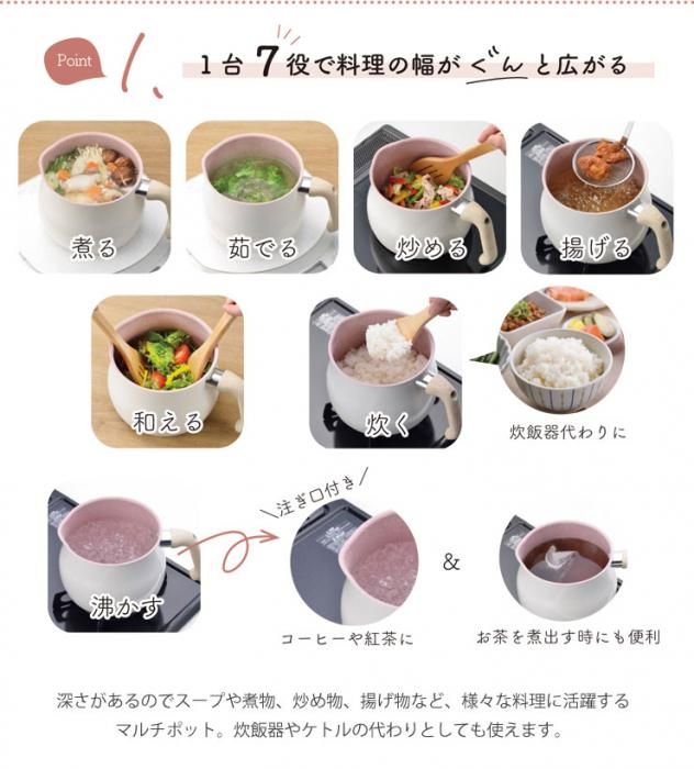 1台で「煮る、茹でる、炒める、揚げる、沸かす、和える、炊く」の7役使える便利なポット。