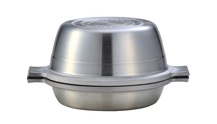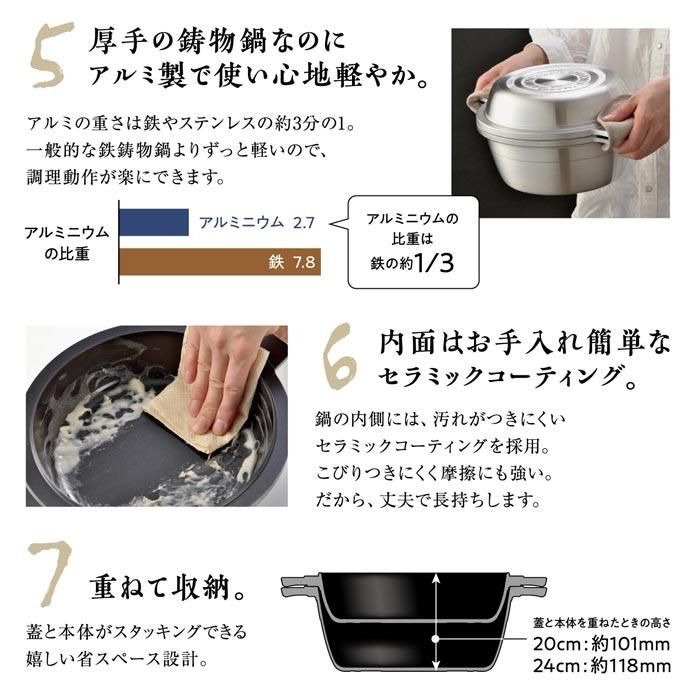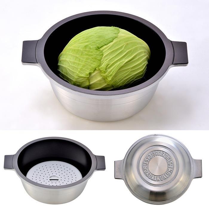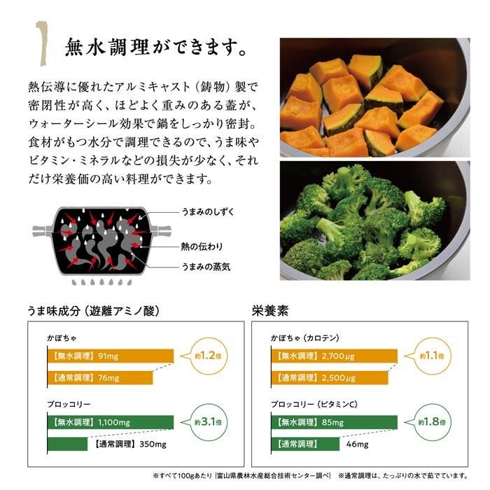 熱伝導に優れたアルミキャスト(鋳造)製で密着性が高いので食材の水分や調味料のみで料理ができ、栄養素やうま味を逃さない