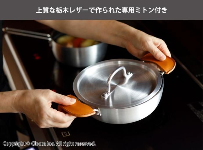 調理器具と兼用蓋、ハンドルや蓋つまみに装着できるレザーミトンの7点セットです。