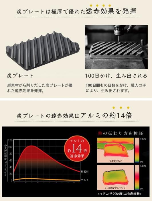● 「炭プレート」の遠赤効果(アルミの約14倍)と独自形状の「皮パリ蓋」との組み合わせで中はふっくらと柔らかく、表面は皮パリに焼き上がります。