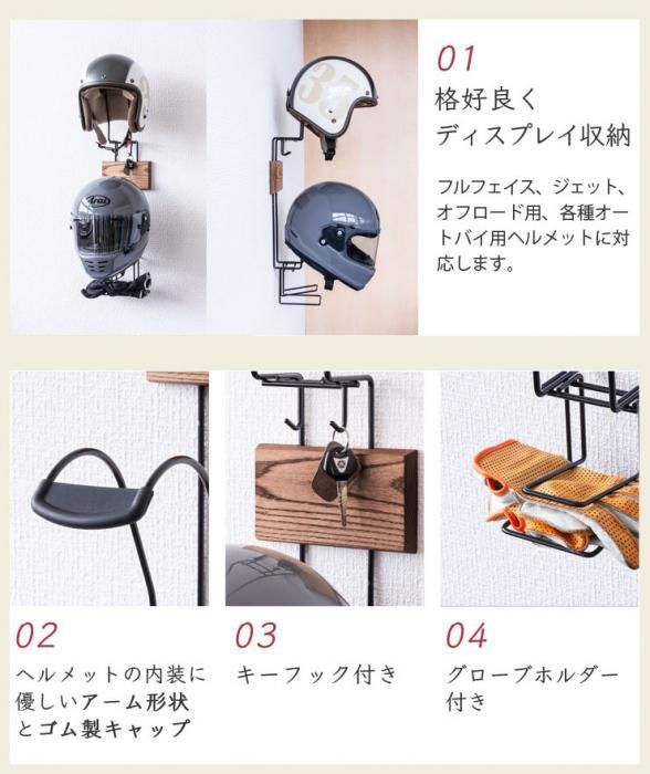 オートバイ等のヘルメットを室内の壁にショップディスプレイのように収納して楽しめます。
