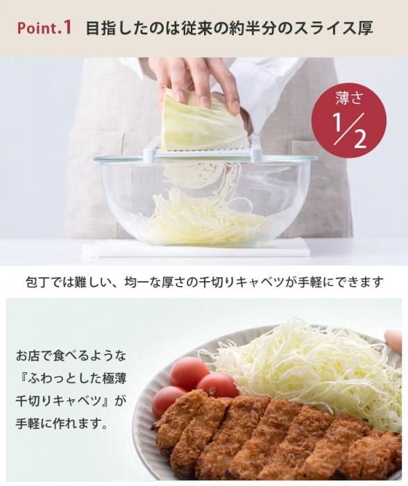 従来のキャベツスライサーを見直し、スライス厚は従来の約半分を目指しました。