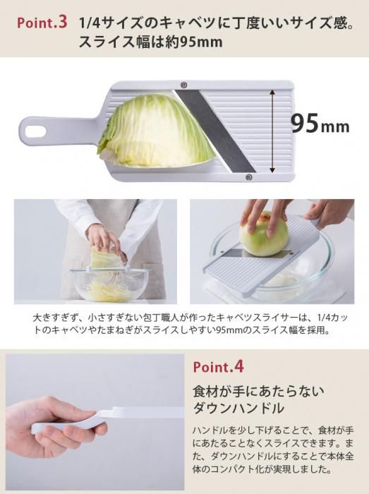 従来のキャベツスライサーは「大きすぎて収納に困る」、逆に小さなスライサーでは「キャベツの千切りが難しい」といった声を受け、包丁職人が作ったキャベツスライサーは、1/4カットのキャベツがスライスしやすい95mmのスライス幅を採用しました。