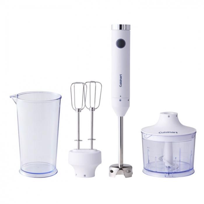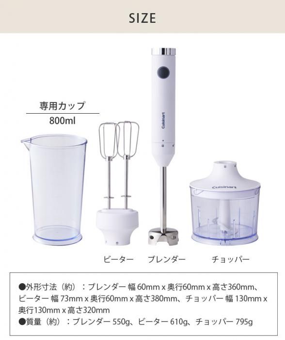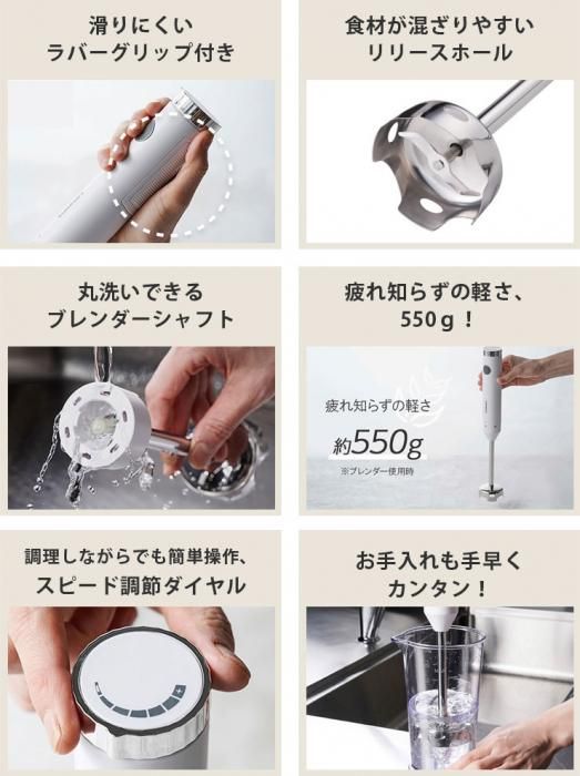 「つぶす」「混ぜる」機能のブレンダー、「泡立てる」「かき混ぜる」ができるビーター、「刻む・ミンチ」ができるチョッパーが付属しており、調理の強い味方です。