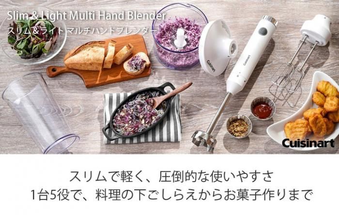 付属のアタッチメントで「つぶす」「混ぜる」「泡立てる」「かき混ぜる」「刻む・ミンチ」の1台5役。料理の下ごしらえからお菓子作りまで活躍するハンドブレンダーです。