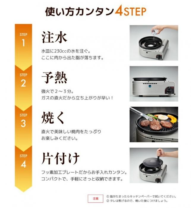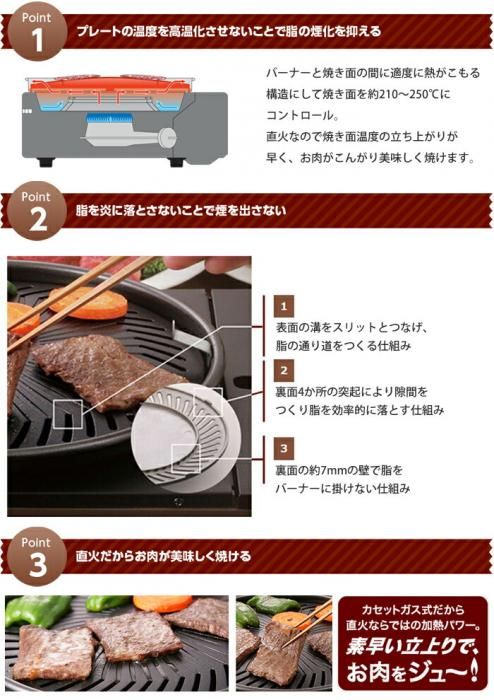 煙の発生を少なく抑え、室内で手軽に焼肉が楽しめるカセットガス式の焼き肉専用グリルです。