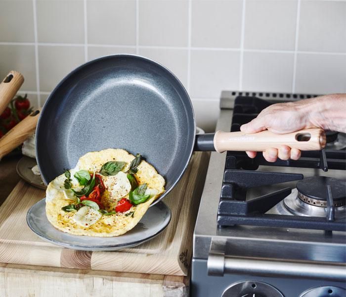 サーモロン セラミック ノンスティック コーティングのおかげで料理はノンスティック=くっつかずお手入れが簡単。PFOA、鉛、カドミウム100%不使用と、ヘルシーさを大切にする人のベストチョイスです。