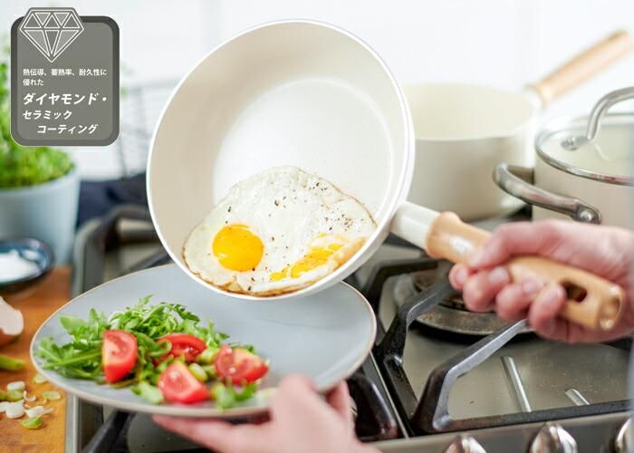 サーモロン・ノンスティック・セラミック・コーティングにダイヤモンドを配合して耐久性をアップ。有害物質が一切含まれておらず、ほとんど砂と同じミネラル成分で作られているので、熱し過ぎても有毒ガスを排出せず、安心して調理ができます。
