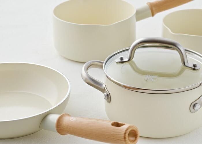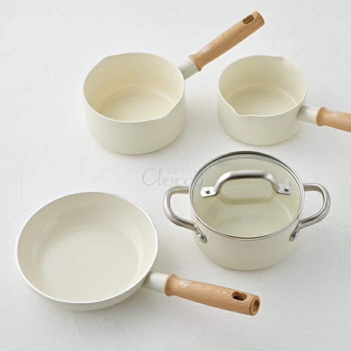 クリームホワイトの本体に木目調ハンドルがナチュラルなビンテージホワイト ミニフライパン。