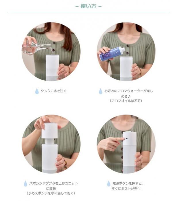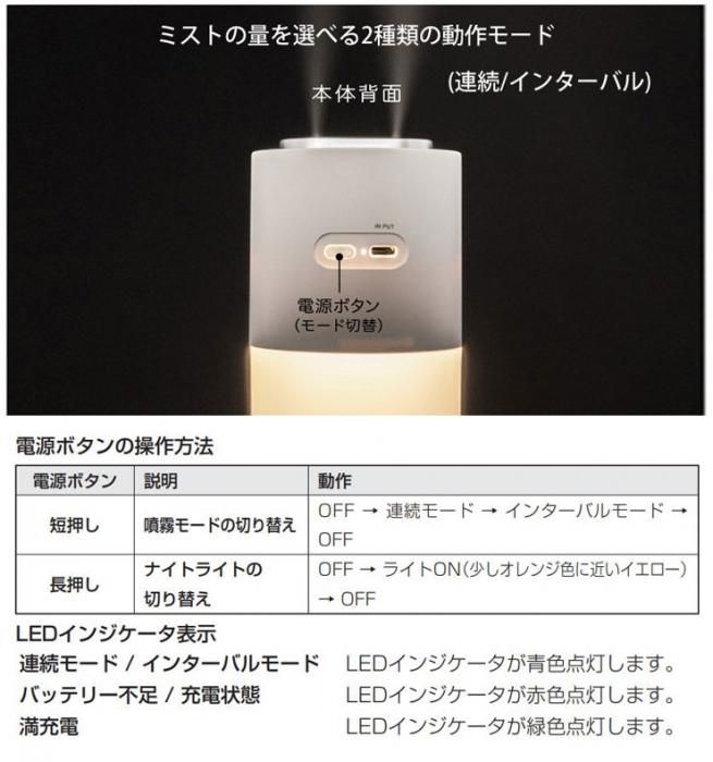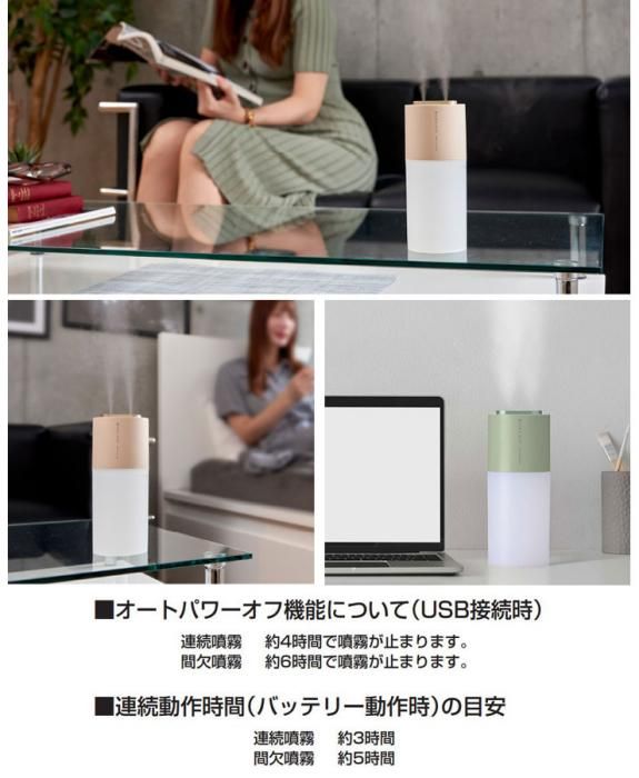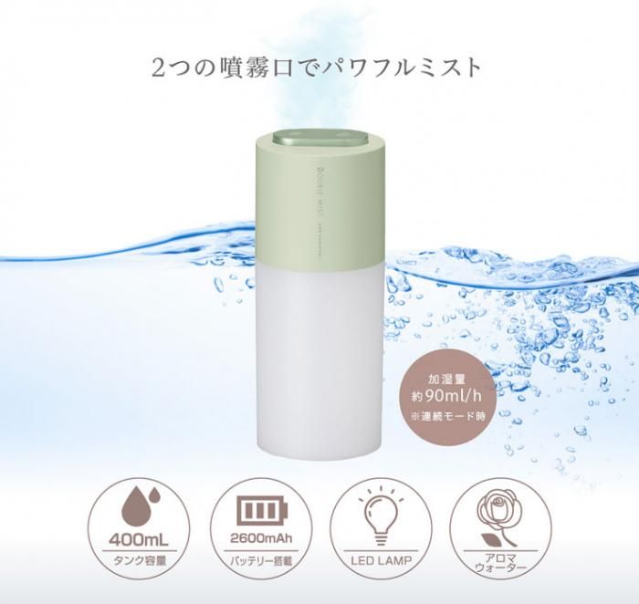 グリーンハウス 充電式ポータブル加湿器 ダブルミスト GH-PHWC 送料無料 当日出荷 分類で探す 家電 季節家電 加湿器 ブランドで探す グリーンハウス 特集ページ 冬を楽しむ特集 家電 価格帯(税込) 3,000円台の商品 リビング 送料無料 ラッピング承ります 持ち運んで加湿できる充電式ポータブル超音波式加湿器 USB充電式なのでどこにでも持ち運び可能 2つの噴霧口でパワフルミスト 静音設計でアロマウォーター対応 gh-phwa 3,280円(税込) 0円 在庫入荷待ちスノーホワイト3,280円(税込)在庫なし3,280円(税込)在庫なしベージュ3,280円(税込)在庫なし3,280円(税込)在庫なしバーントアンバー3,280円(税込)在庫なし3,280円(税込)在庫なしセージグリーン3,280円(税込)在庫なし3,280円(税込)在庫なし SOLD OUT 製品について性能詳細お買い物ガイドクロッカについて 持ち運んで加湿できる充電式ポータブル加湿器 充電式なので生活にあわせて、昼はリビング、夜はベッドサイドなど、自分のいる場所に持ち運べるポータブル加湿器です。パソコンやお手持ちのUSB-AC充電器で充電できます。動作音はささやくように静かで仕事や睡眠の邪魔をしません。小型ながら2つの噴霧口でパワフルミスト、静音設計でアロマウォーターにも対応しています。 状況にあわせて、連続モードと間隔をあけて動作するインターバルモードの2種類のモードを用意。インターバルモードのゆったりとしたリズムはリラックスした感覚をもらたします。 すぐにミストが出る超音波式 ミストの量を選べる2種類の動作モード(連続/インターバル) USB充電でどこでも使える 音が気にならない静音設計 オートパワーオフ機能搭載 ナイトライト機能 アロマウォーターに対応 アロマオイルは使用しないでください。カビや雑菌の発生を防ぐため、タンクやスポンジを定期的に清掃してください。他のUSB機器との同時使用についての動作は保証いたしかねます。省電力モードでの動作は保証いたしかねます。本体を傾けると下部ユニットより水が漏れ出すおそれがありますので、不安定な場所に置かないでください。 電源DC 5V(USB Type-Cポートより供給)バッテリー容量:2600mAh 連続動作時間連続噴射:約3時間間欠噴射:約5時間 消費電力最大550mA(連続モード) 充電USB Type-Cポート(充電用) サイズ本体:W77×D77×H190(mm)タンク容量:400ml 重量約232g 材質ABS、PP 加湿量約90ml/h(連続モード)、約65ml/h(インターバルモード) 付属品専用USBケーブル(約100cm)、スポンジ×4個(内2個は本体装着済)、取扱説明書/保証書(6ヶ月間) 備考 中国生産 RoHS適合 アロマオイルは使用しないでください。 RERATED ITEMS関連商品グリーンハウス 超音波式 クラウドミスト加湿器 GH-AHCA-WHグリーンハウス USBアロマディフューザー&加湿器 GH-UAHA