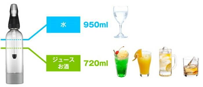 水なら950ml、ジュースやお酒などは720mlの炭酸飲料が作れる