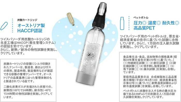「ツイスパソーダ」スターターキットには、ボトル、キャップ、ノズル、6回分の炭酸カートリッジに、日本語の取扱説明書に加えてオリジナルソーダのレシピが詰まったレシピブックが同梱されているので買ってすぐに楽しめます。