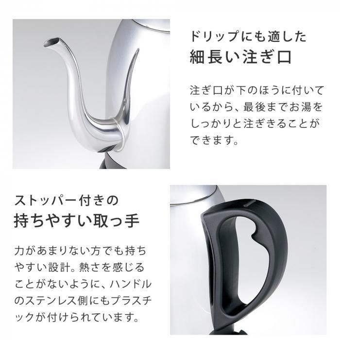 コーヒーポットのような細長い注ぎ口は、注ぐ湯量を調節しやすく、普段使いはもちろん、コーヒーをドリップしたい時にも便利です。