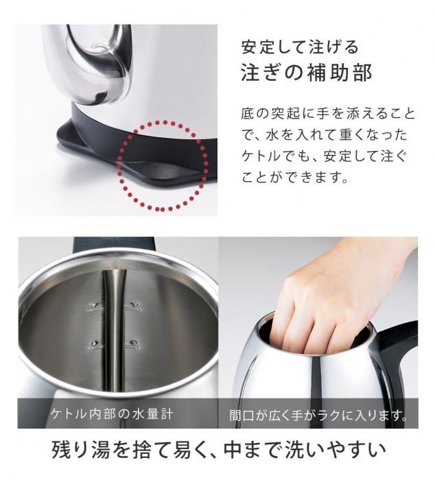 沸騰が早く、自然保温力が高いため、電気代を節約。自動電源OFF機能や空炊き防止機能、注ぐ湯量を調節しやすい注ぎ口にずれにくい蓋などなど、スタイリッシュなデザインの中にもたくさんの思いやりがつまった商品です。