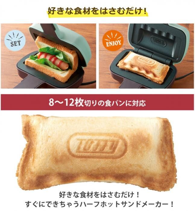トフィー ハーフホットサンドメーカー K-HS3 全3色 送料無料 当日出荷 分類で探す キッチングッズ キッチン家電 ブランドで探す トフィー ラドンナ 価格帯(税込) 5,000円台の商品 キッチン用品 送料無料 ラッピング承ります 一枚の食パンを折りたたんで作るハーフホットサンドができる電気ホットサンドメーカー 一枚で作る食べ切りサイズのホットサンド 8〜12枚切りの食パンに対応 ladonna-k-hs3 5,500円(税込) 0円 K-HS3ペールアクア5,500円(税込)在庫なしアッシュホワイト5,500円(税込)在庫なしシェルピンク5,500円(税込)在庫なし SOLD OUT 製品について性能詳細お買い物ガイドクロッカについて 一枚の食パンを折りたたんで作る“ハーフホットサンド”ができる電気ホットサンドメーカー。一枚で作るので、女性やお子様にもぴったりな嬉しい食べ切りサイズ。8〜12枚切りの食パンに対応しています。 パンを置いて好きな具材をはさむだけで、あっという間にハーフホットサンドが出来上がり。ハム&チーズなどの定番ホットサンドから、カレーをはさめばカレーパン、焼きそばをはさめば焼きそばパン、チョコやフルーツをはさめばスイーツに仕上がります。 毎日の朝ごはんはもちろん、休日のランチやカフェタイムにも大活躍。コンパクトサイズで立てて置けるため、一人暮らしのキッチンにもすっきり収納できます。 女性やお子様にもぴったり。1枚で作るから、カロリー控えめの食べ切りサイズ。 パンを置いて好きな食材をはさむだけ。使い方はシンプルで簡単。 レトロかわいいデザインに大注目。立てて置けるから、収納場所に困らない。 食パンサイズ:8〜12枚切りの食パンに対応。 サイズ本体:約W167×D220×H96mm電源コード長:約0.7M 電源AC100V 50-60Hz 定格消費電力500W 重量約750g 生産国中国 ブランド 製造元smart -スマート 山崎実業RERATED ITEMS関連商品レコルト ソロブレンダー サンテ 300ml