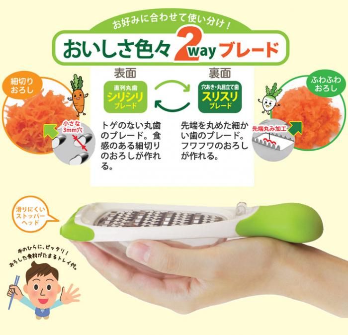 食卓で大根・生姜・ワサビ・レモンの皮など香味野菜をすりおろし、手軽に料理に風味付けすることのできる手のりサイズの「すりおろし器」です。